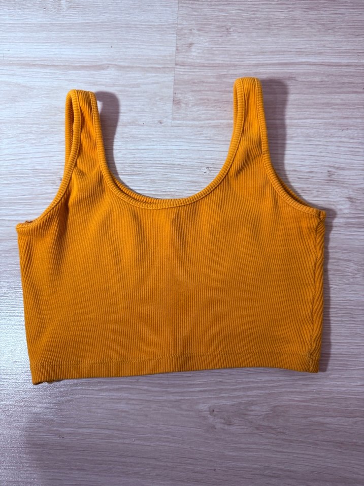 Canlı sarı renkte, tek renk, kolsuz ve kısa kesim crop top. Rahat sentetik kumaştan, günlük sokak stili için uygundur.