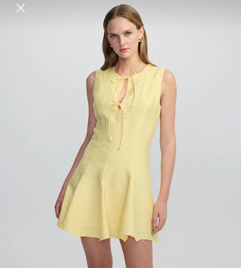 Kolsuz, sarı mini elbise, V yakalı ve bağcıklı detaylıdır. Yumuşak keten kumaştan yapılmış, oturan kesimi ve fırfırlı etek ucu ile romantik akşamlara uygundur.