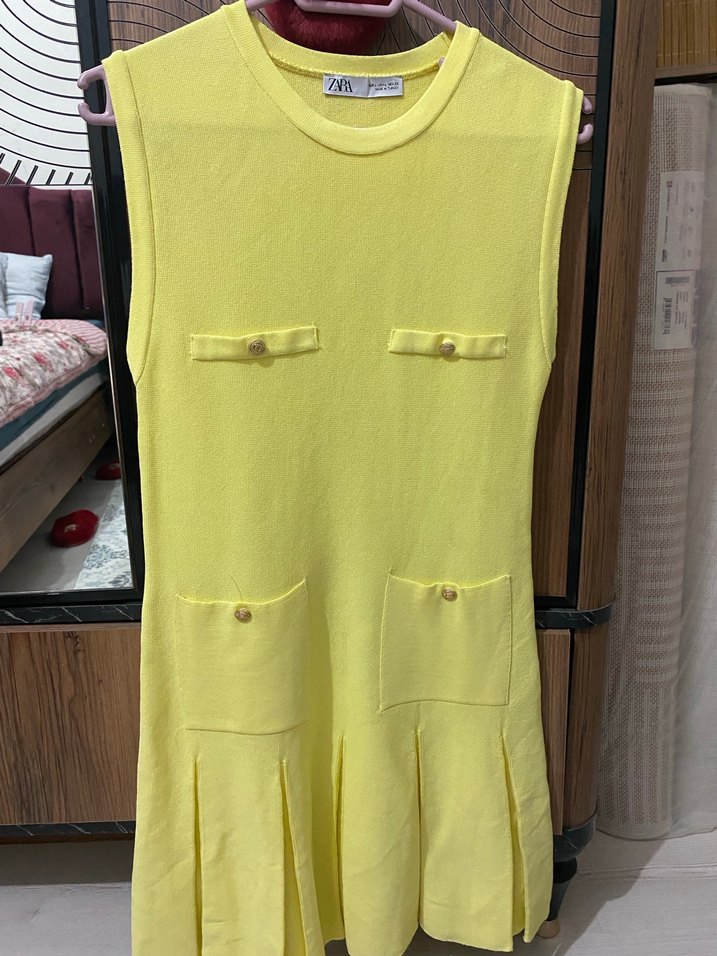 Sarı kolsuz triko elbise, bisiklet yaka ve vücuda oturan kesim. Düğme detaylı ve ön cepli, minimalist günlük tarz için uygun.