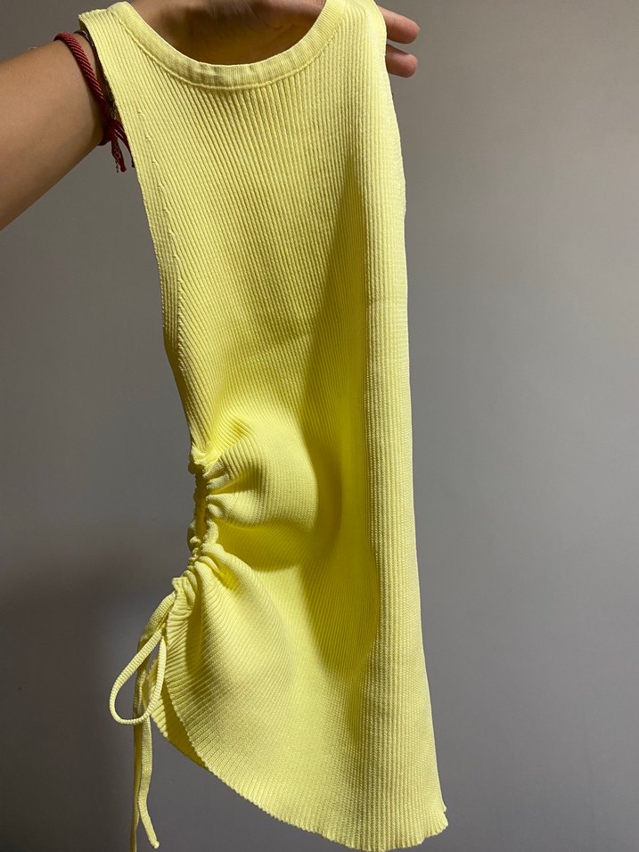 Sarı kolsuz, yüksek yakalı, yanı büzgü detaylı triko bluz. Vücuda oturan kesimi var. Xs - s için uygun. Trendyolmilla.