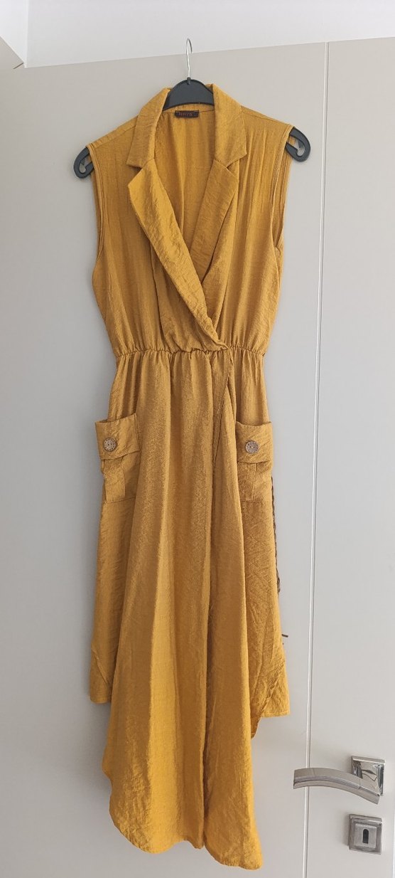 Sarı, kolsuz, uzun keten elbise, yakasında kesik detay ve bol kesimiyle bohem tarzı yansıtır. Günlük kullanıma uygundur.
