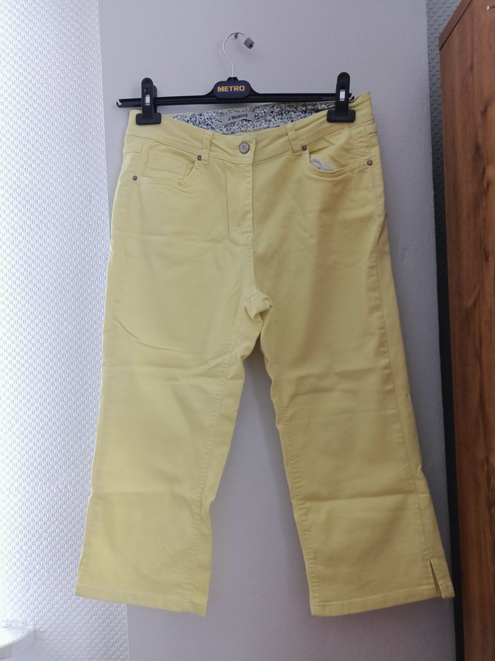 Pastel sarı renkte, kısa boy ve regular fit kesime sahip, kemerli koton kumaştan kadın pantolon. Sokak stiline uygun, dış mekan kullanımı için ideal.J.WARGAS marka kapri pantalon. beden 40 %97 pamuk %3 likra boy 77 cm bel 40 cm.x2 kalça 48 cm.x2 paça 20 cm.x2