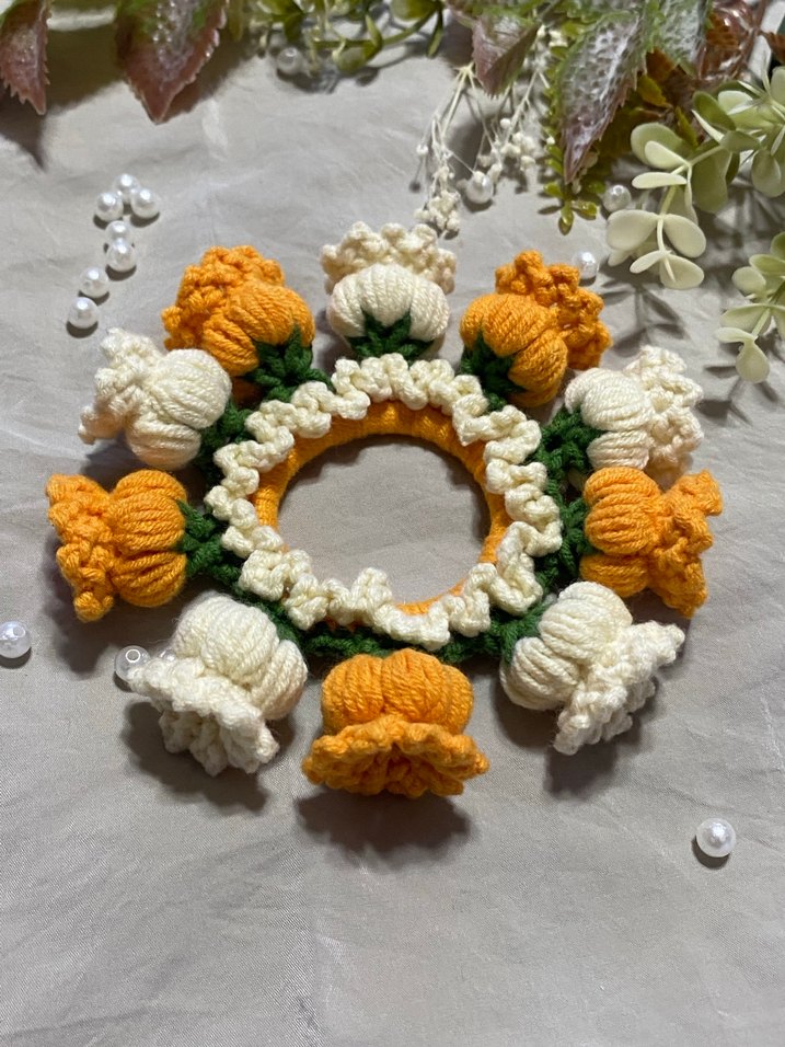 El yapımı bohem tarzı, hardal sarısı ve beyaz örgü çiçeklerle süslenmiş dokulu ve renkli topuz tokası.