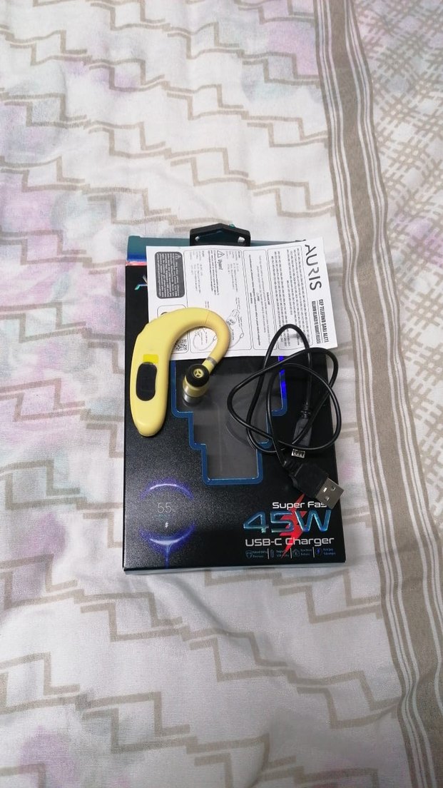 USB-C şarj kablosu ve 45W hızlı şarj desteği ile açık sarı kulak arkası Bluetooth kulaklık.