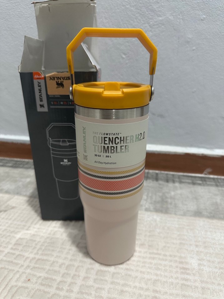 Gri ve sarı renkte, taşıma kulplu ve güvenli kapaklı termos matara. Uzun süre içeceklerin sıcak veya soğuk kalmasını sağlar. Üzerinde "QUENCHER H2O TUMBLER" yazısı ve renkli çizgiler bulunur.