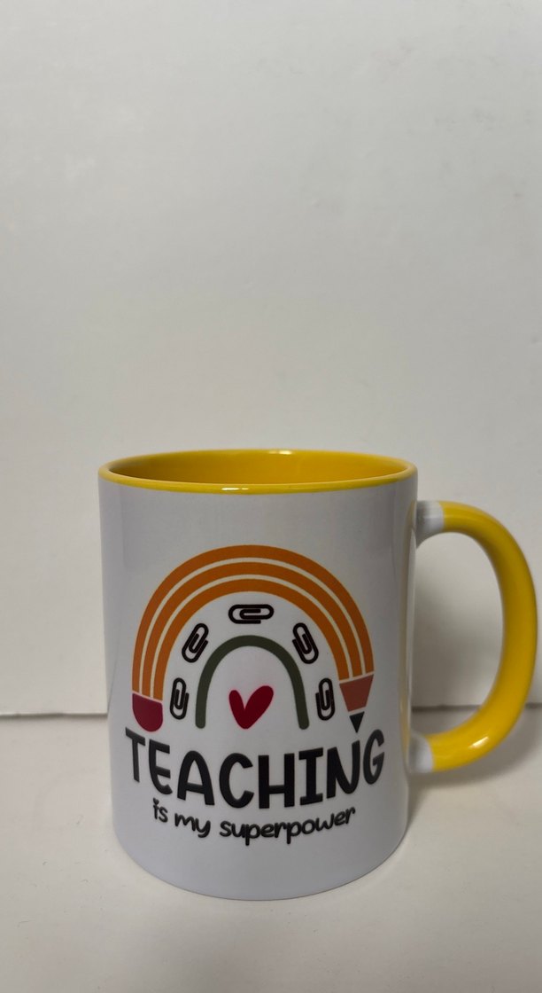 Sarı kulplu ve iç kısmı renkli olan bu kupa, gökkuşağı ve "TEACHING is my superpower" yazısıyla süslenmiştir. ☕ içi sarı renk