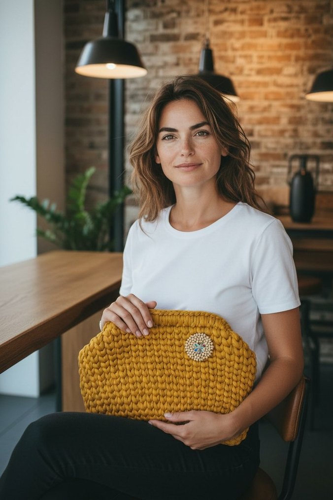 Sarı örgü kumaştan yapılmış, bohem tarzda ve baskılı desenli kadın çantası, günlük kullanıma uygundur.
