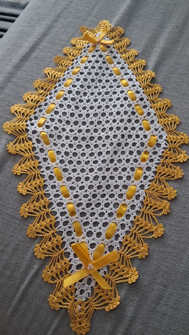 Sarı kurdele detaylı, beyaz tığ işi ile hazırlanmış bohem dantel örtü. El emeğiyle şık bir görünüm sağlar.