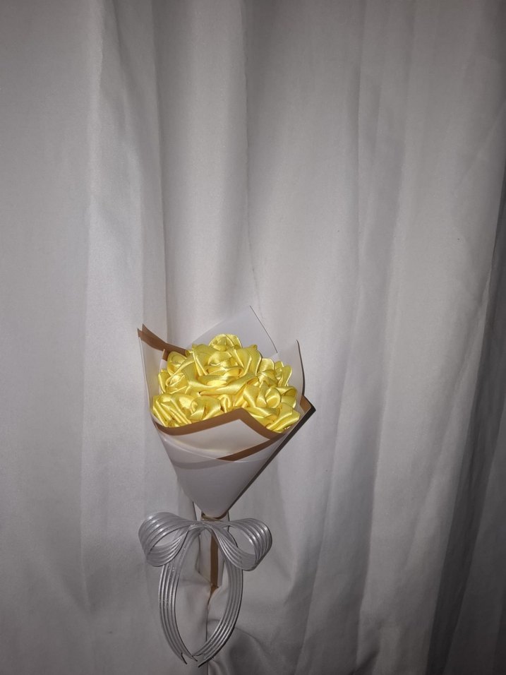 Beyaz buket kağıdına sarılmış sarı kurdele çiçek buketi. Sevdikleriniz için solmayacak bir buket. Sipariş alınır.