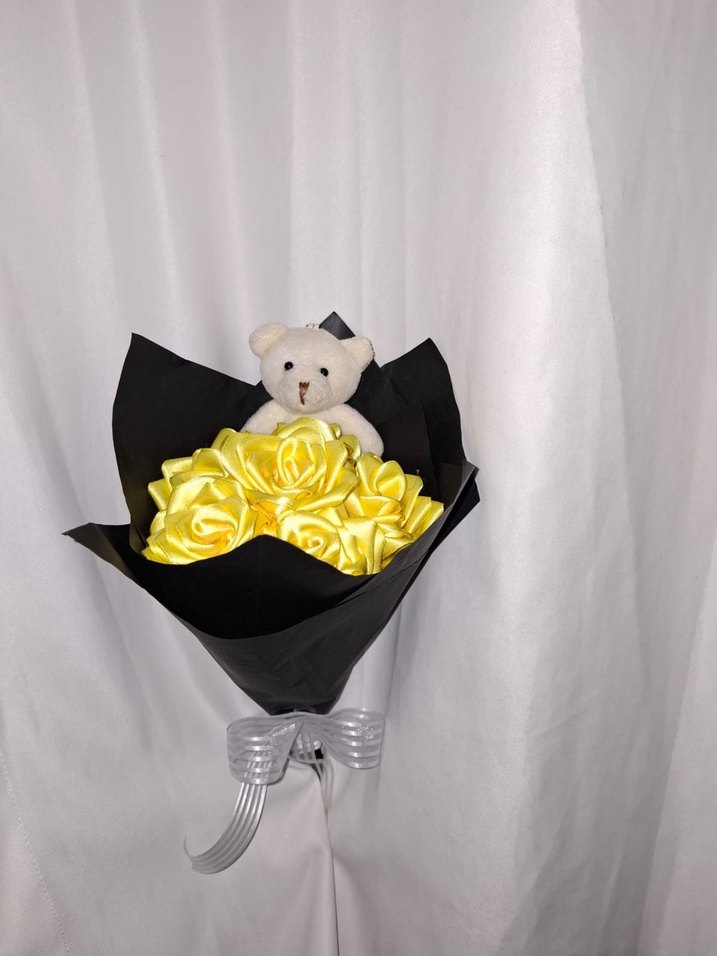 Siyah buket kağıdına sarılmış krem ayıcıklı, sarı kurdele çiçek buketi. Sevdikleriniz için solmayacak bir buket. Sipariş alınır.