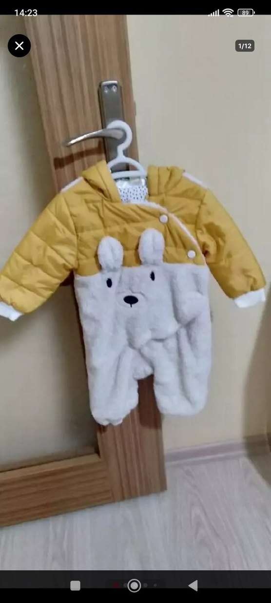 Açık sarı renkte, yumuşak ve sıcak kumaştan yapılmış, kürklü detaylı ve baskılı desenli bebek erkek tulumu.