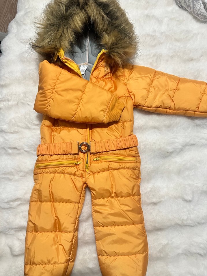 Kürklü kapüşon ve kesik yaka detaylı, renkli ve desensiz sarı bebek kız kayak tulumu. ❄️