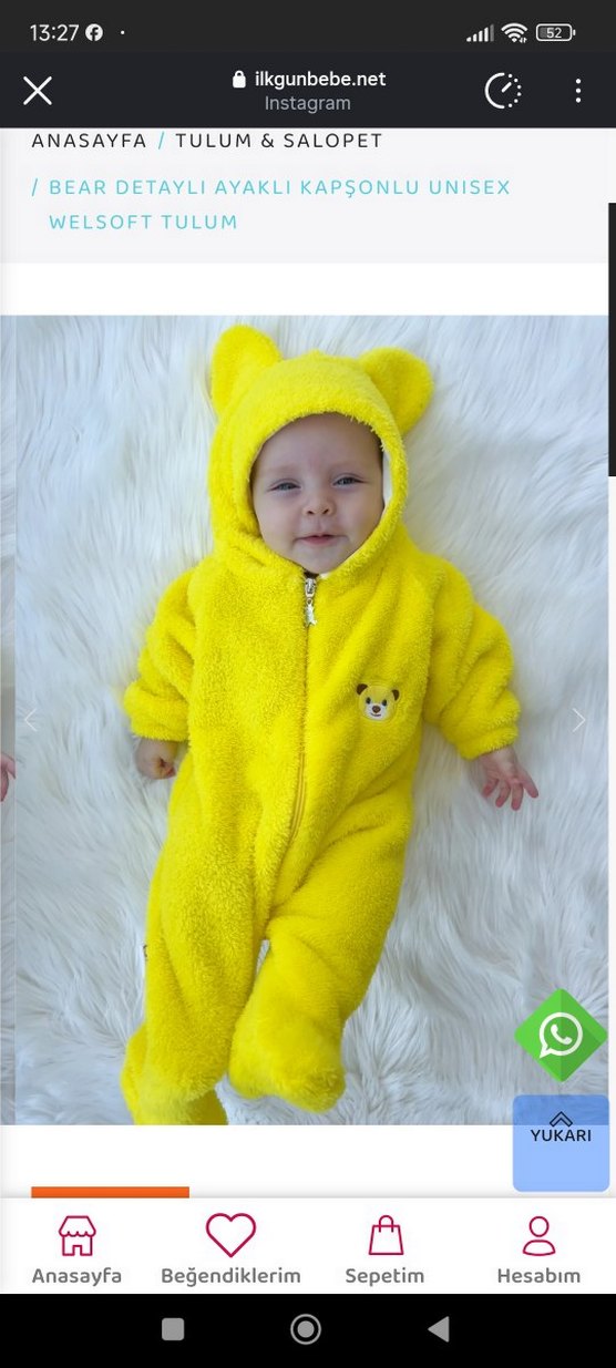 Sarı renkli, yumuşak ve sıcak kumaştan yapılmış, kulaklı kapüşon ve küçük ayı işlemeli kürklü bebek tulumu. sıfır ürün ,0-6 ay