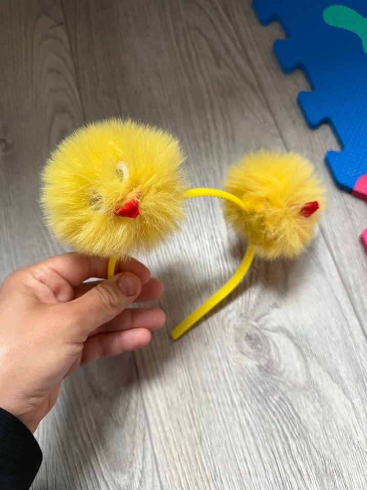 Çift sarı kürklü ponpon ve kırmızı detaylı, esnek bantlı çocuk saç bandı.