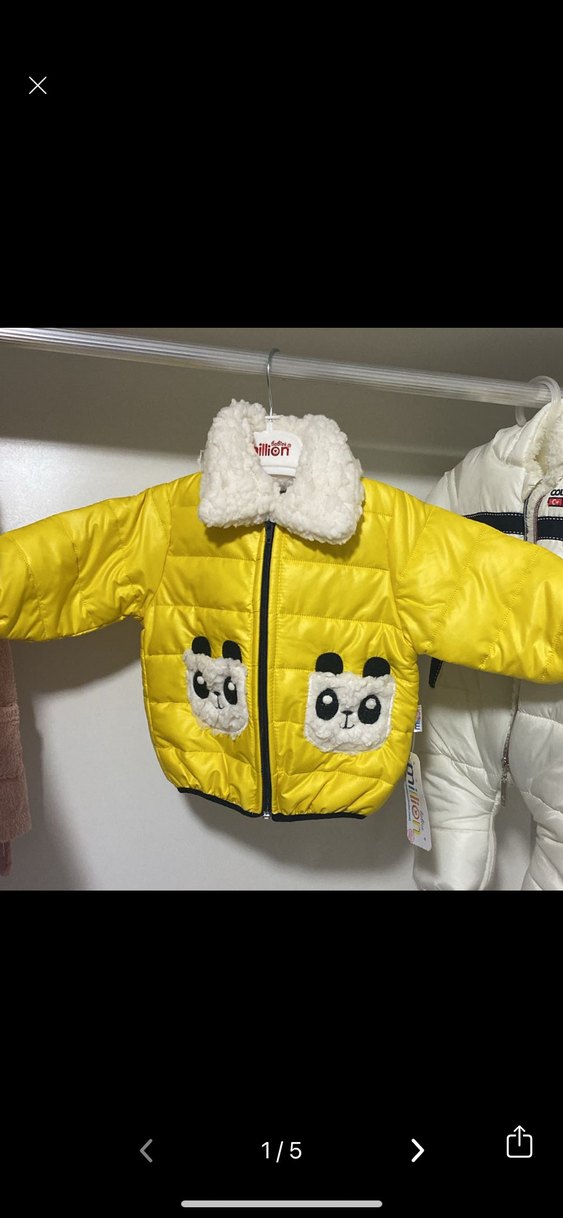Sarı, kürklü yakalı ve panda desenli cepleriyle, trend sokak modasına uygun, fitted kesim erkek çocuk montu.