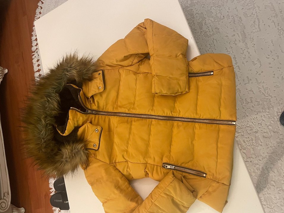Sarı, kürklü kapüşonlu, kesimi vücuda oturan bu kışlık mont, parlak yüzeye ve normal midi boy uzunluğa sahiptir. Dış mekan için uygundur. orjınal zararının nereydse gıc kullanılmadı dıye ılırım