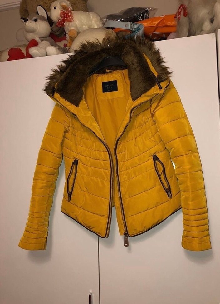 Sarı renkli, kürklü yakalı ve orta uzunlukta, dar kesim kadın kışlık mont. Askılı kollu ve rahat, yumuşak dokusu ile günlük sokak giyimine uygun.