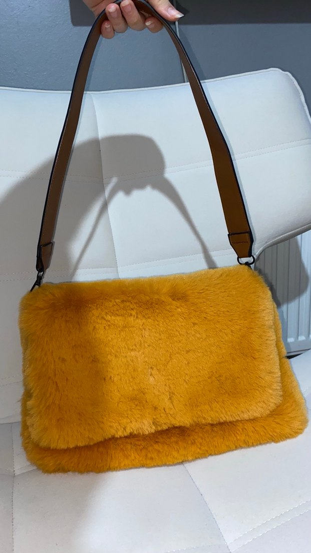 Kadınlar için parlak sarı kürklü dış yüzeye sahip, yumuşak ve rahat dokulu omuz çantası. Kahverengi saplı, bohem ve retro tarzıyla uyumlu. Ürün kullanılmadı kenar kısmında belli olmuyor kedim ısırıyorken yakaladım hafif bi diş izi var nokta nokta