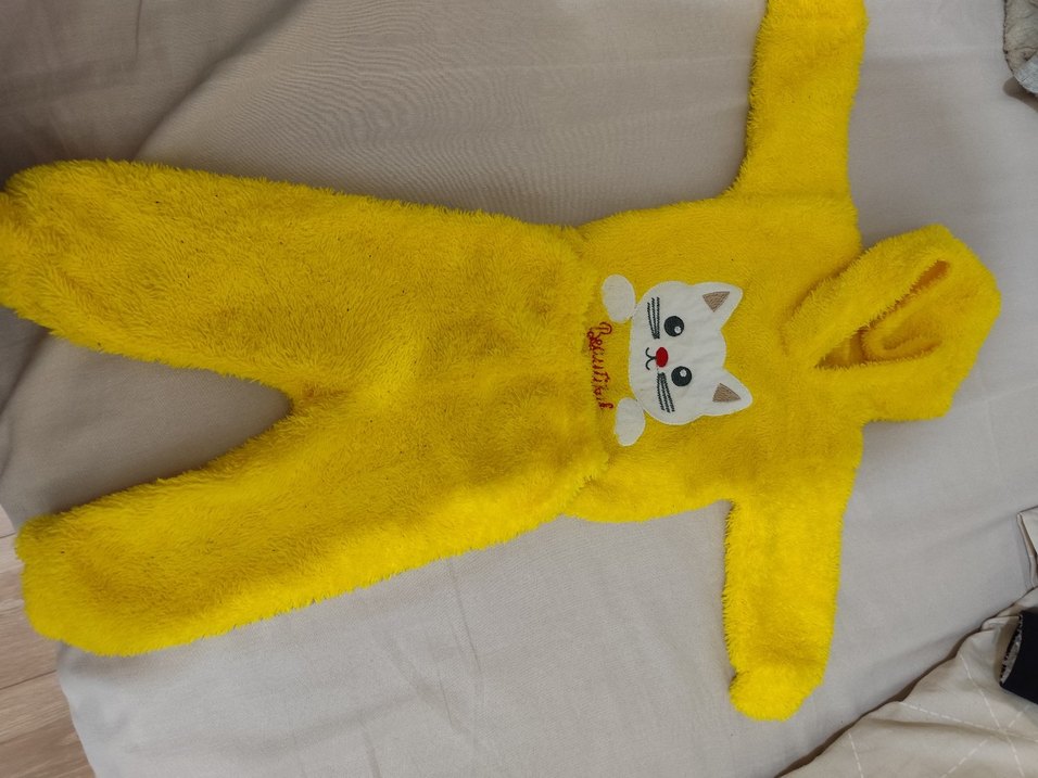 Sarı renkli, kürklü dokulu ve renkli nakış detaylı, sokak stili kedi kıyafeti.