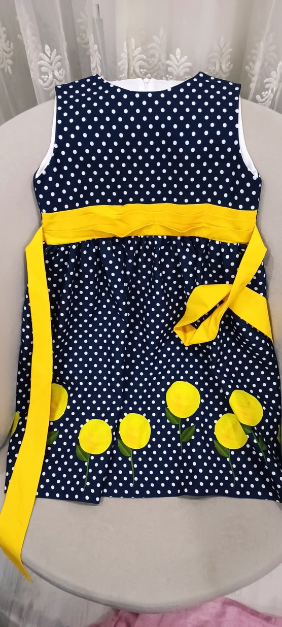 Kız çocuk elbisesi, oturan kesim ve yakalıdır. Sentetik kumaştan, puantiyeli desenli, sarı çiçekli fırfır ve kuşaklıdır.