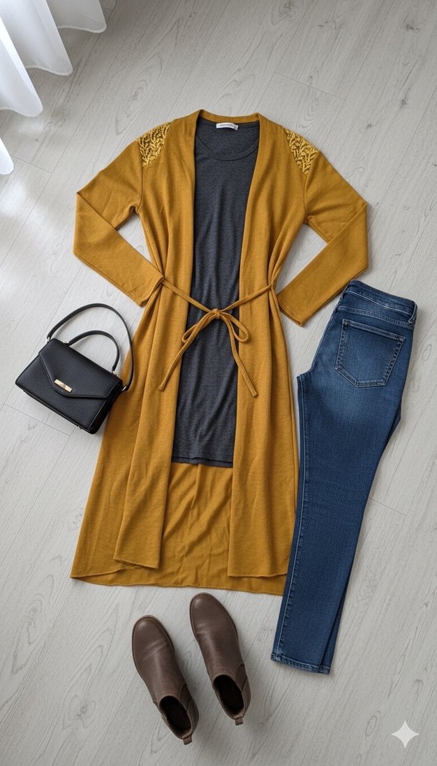 Sarı renkli, uzun kollu ve kuşaklı bel detayına sahip bu hırka, rahat ve salaş kesimlidir. Midi boyda ve notched lapel yakalıdır, gündelik kullanıma uygundur.