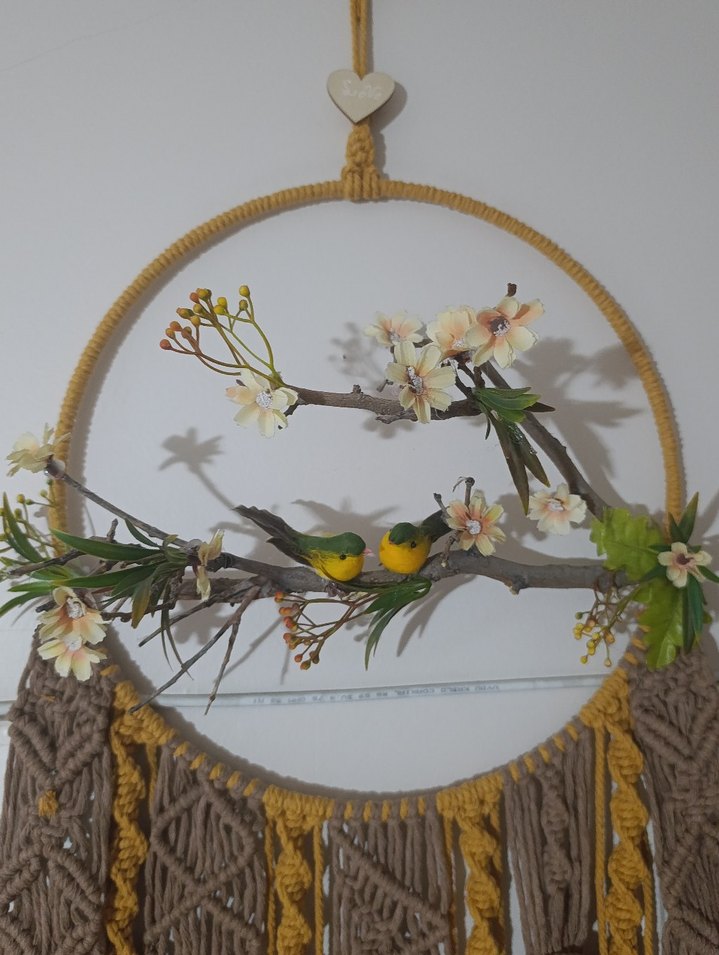 Pastel sarı detaylı makrome duvar süsü, yapay çiçekler ve dal üzerindeki iki küçük dekoratif kuş içerir. çap yaklaşık 35 cm