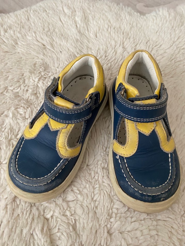Sarı ve lacivert renklerde kauçuk ilk adım ayakkabısı, bağcıklı tasarımla kolay kullanım sağlar. Trend sokak stili için uygundur.