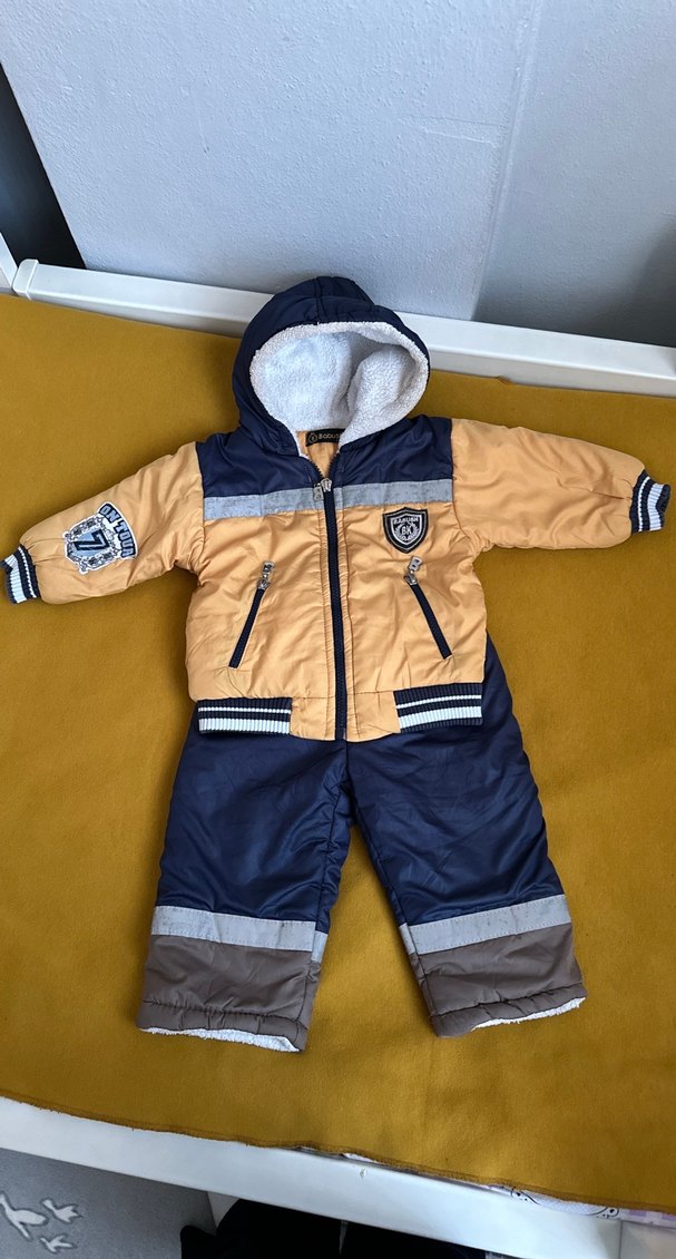 Sarı ve lacivert renklerde, yumuşak kürklü bebek erkek kayak tulumu. Kapüşonlu, fermuarlı cepli ve tokalı detaylara sahiptir. Soğuk havalar için uygundur. ❄️