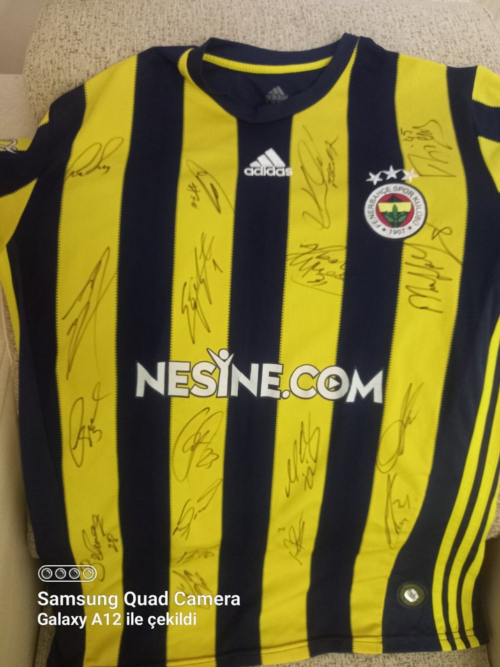 Sarı-lacivert çizgili, kısa kollu, yuvarlak yaka erkek forma.futbolculardan orjinal imzalanmistir