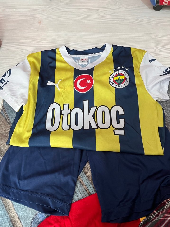 Erkekler için kısa boy, dar kesim forma. Sentetik kumaştan, yuvarlak yakalı, kısa kollu. Sarı-lacivert çizgili, Otokoç baskılı ve cırt cırtlı detaylı, spor sokak stili için uygun. ⚽