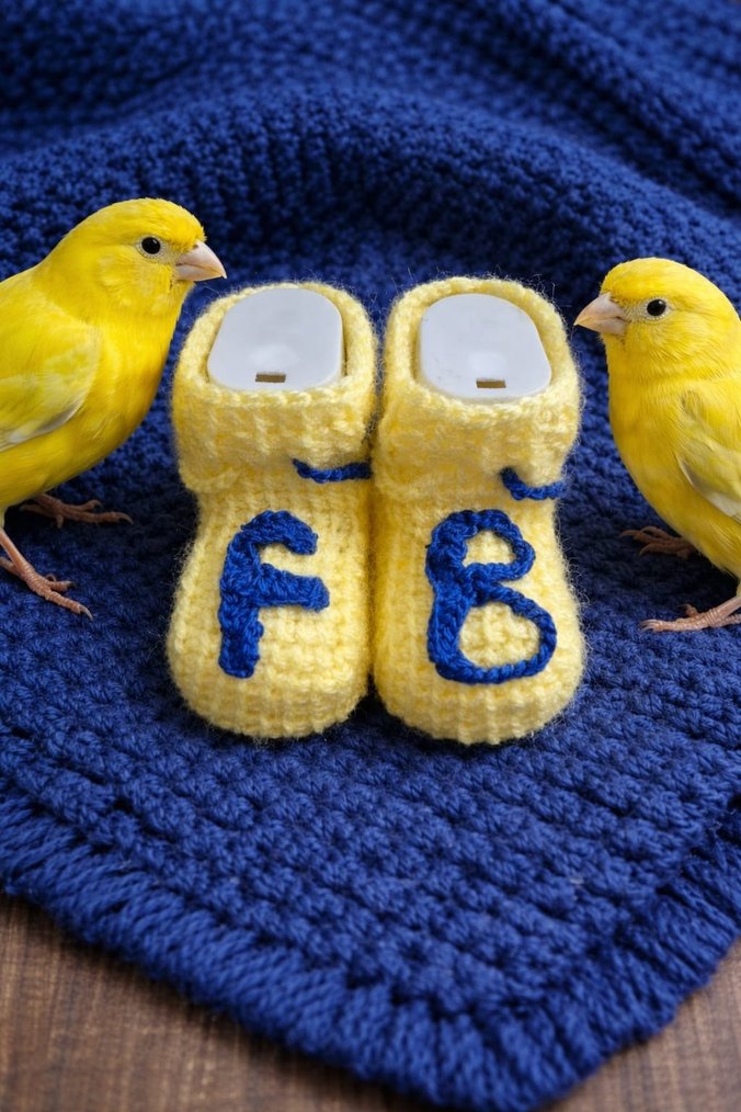Yumuşak örgü kumaştan yapılmış, üzerinde mavi "F" ve "B" nakışlı sarı örgü bebek patik. fenerbahçe taraftar