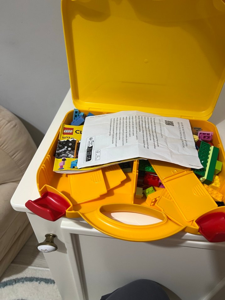 Sarı renkli taşınabilir kutuda renkli Lego eğitim seti ve kullanım talimatları bulunur.