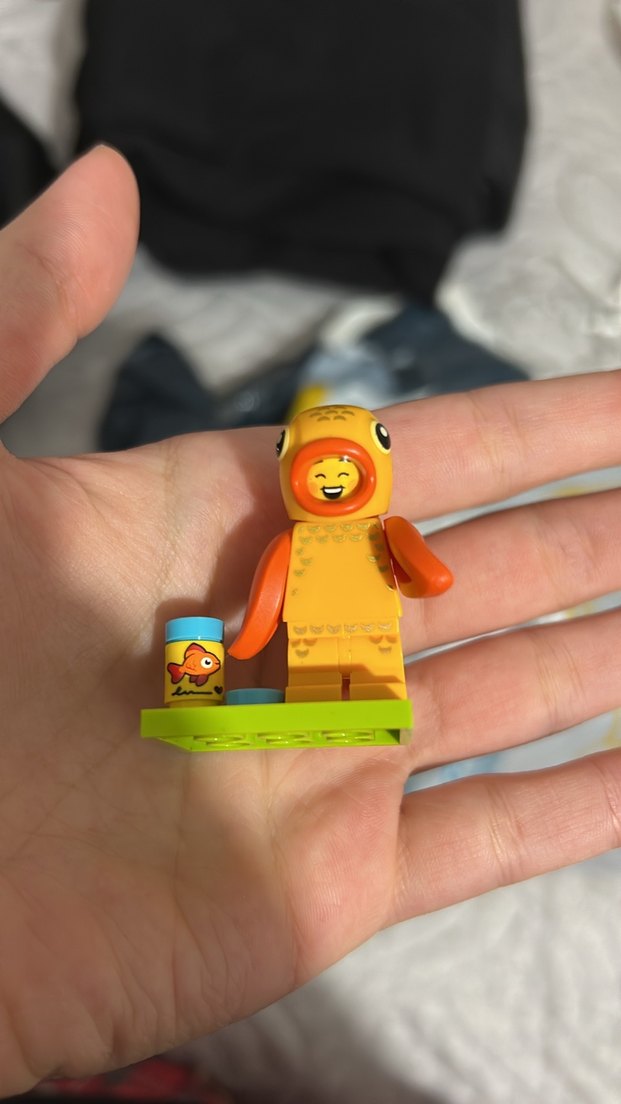 Sarı renkli Lego figürü, ördek kostümü giymiş ve üzerinde balık resmi olan küçük bir kutu tutuyor, yeşil taban üzerinde duruyor. Orijinal bu gün aldım ancak istediğim çıkmadı o yüzden satıyorum kutusu ve kağıdıyla göndericem çift yüzü var