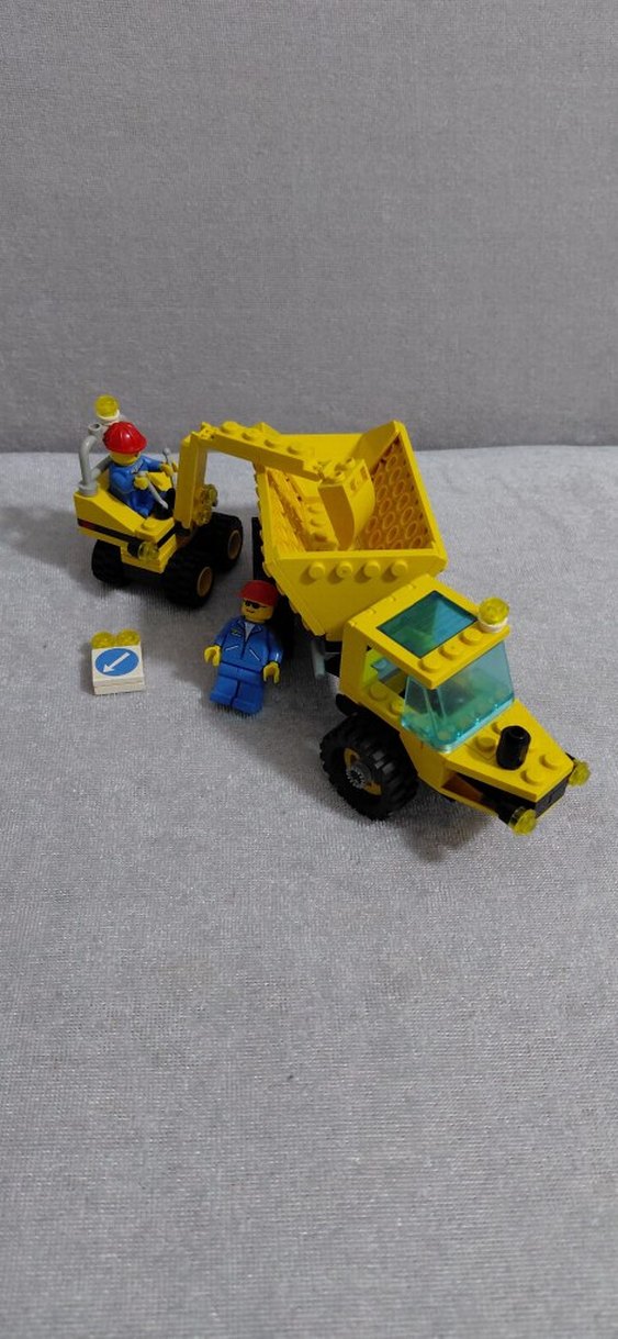 Renkli sarı Lego seti, iki minifigürlü damperli kamyon ve yükleyici ile küçük bir işaret içerir. 1996 yılından kalma kamyon ve kepçe seti orijinal koleksiyonluk uzun yıllardır durduğu için yılların getirdiği yorgunluk var tabi ancak kondisyon olarak iyi durumdadır