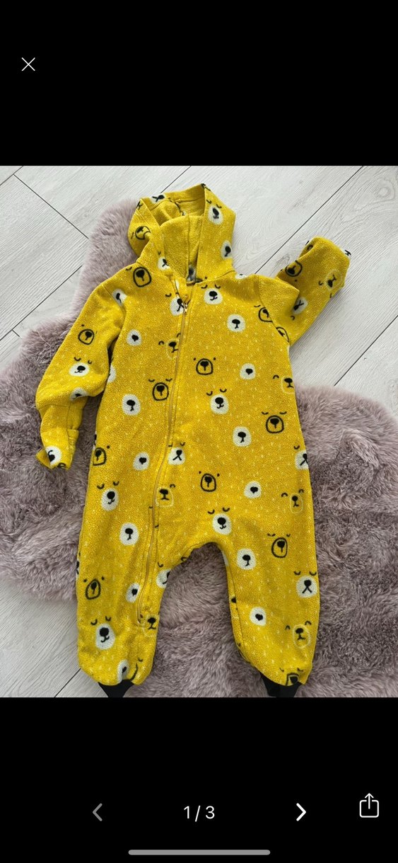 Canlı sarı renkte, leopar desenli, kürk detaylı yumuşak ve sıcak bebek tulumu.