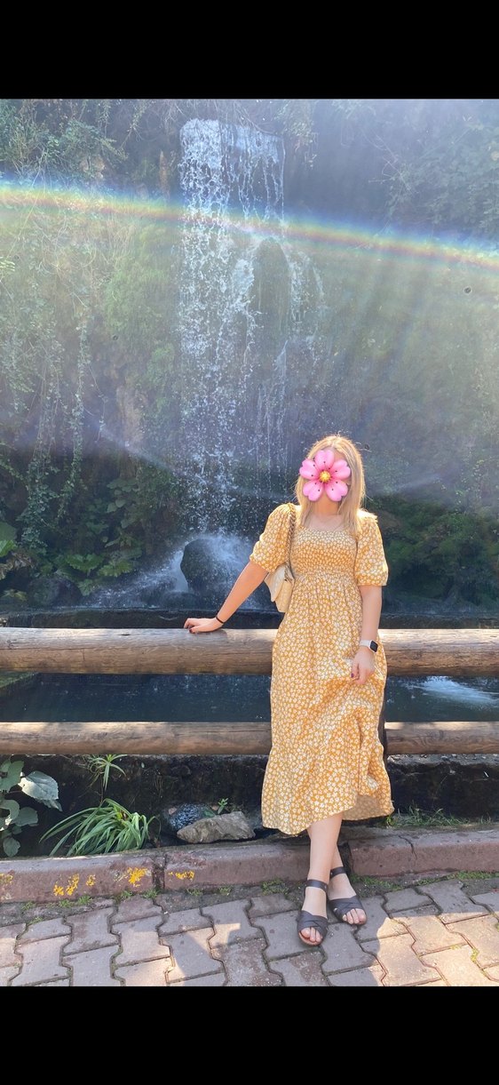 Pastel sarı leopar desenli bohem elbise, straplez yakalı, kabarık askılı ve bol kesim, yumuşak sentetik kumaştan.