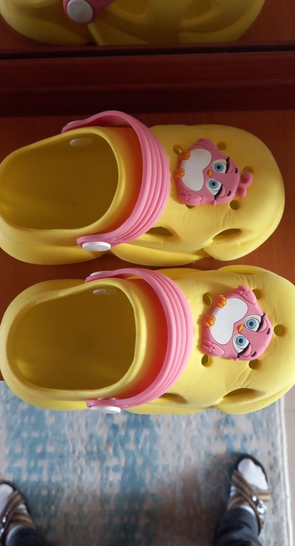 Sarı kauçuk kız terliği, renkli leopar desenli ve tokalı bantlı. Bohem ve retro tarzlara uygun eğlenceli pop kültür havasında.