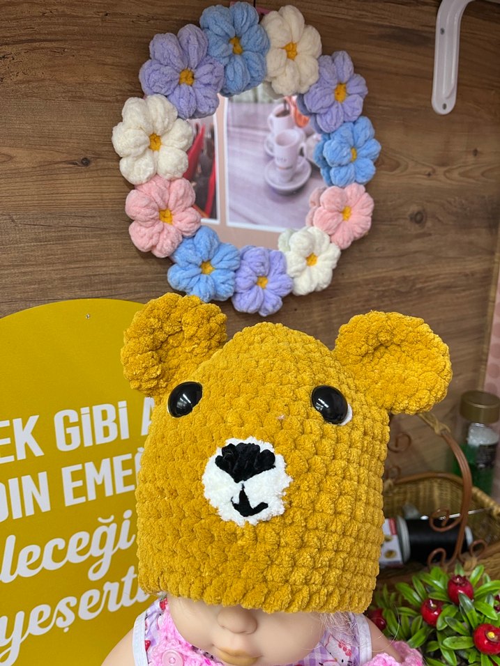 Sarı renkte, leopar desenli örgü çocuk bere, sevimli ayı yüzü detaylı. Bohem tarzına uygun yumuşak örgü malzeme.