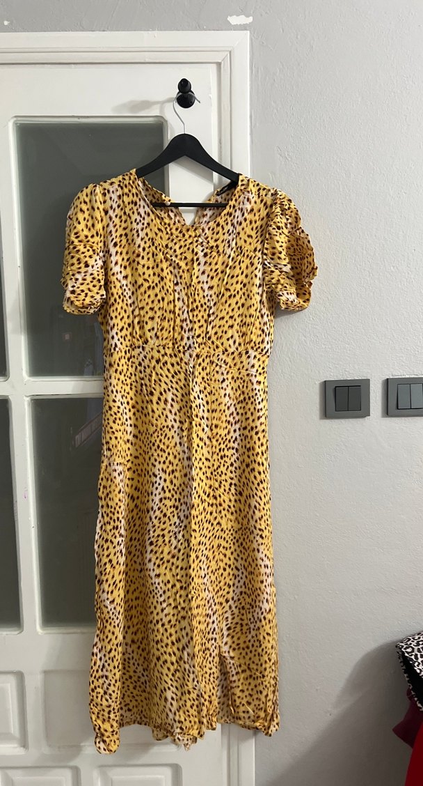 Sarı leopar desenli uzun elbise, kısa balon kollu ve V yakalıdır. Salaş kesim ve düğmeli ön detaylarla bohem ve retro tarzı yansıtır. Hiçbir kusuru yoktur
