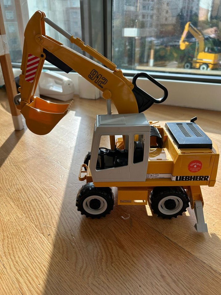 Renkli sarı oyuncak kepçe, hareketli kol ve kepçe ile "LIEBHERR" markalıdır. Detaylı tekerlekler ve sağlam kabini bulunur.