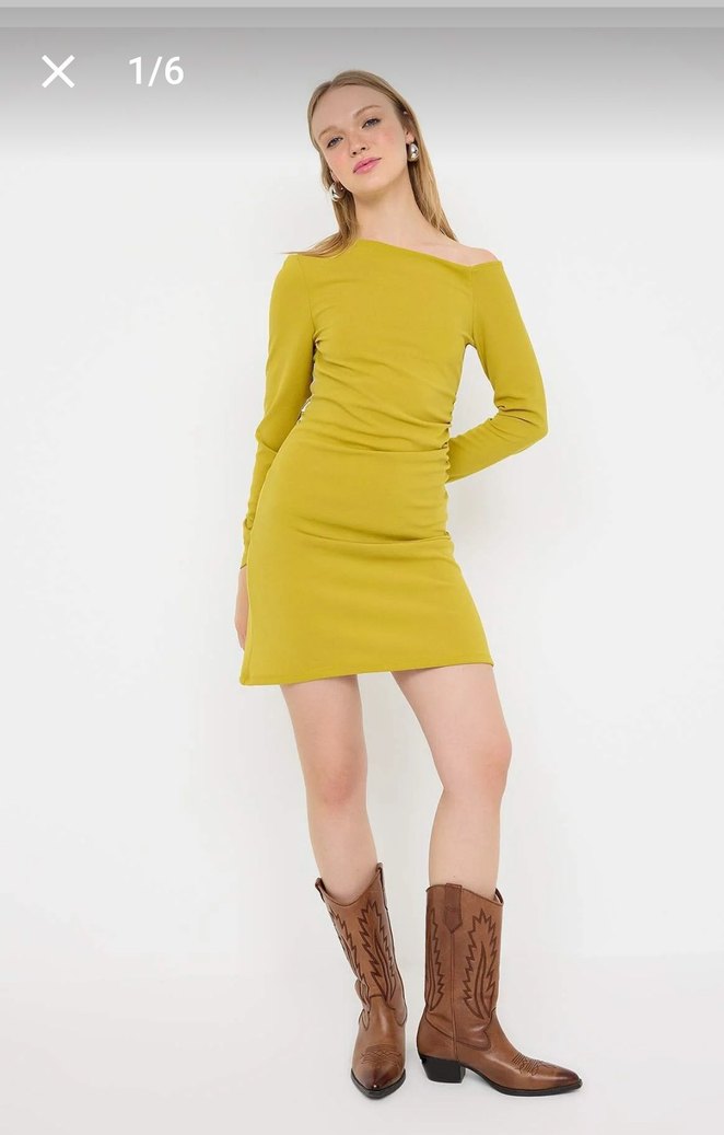 Sarı likralı mini elbise, uzun kollu ve tekdüze. Teknolojik kesimi ve tekne yakasıyla gündelik kullanıma uygun, minimalist ve çağdaş tarzda.
