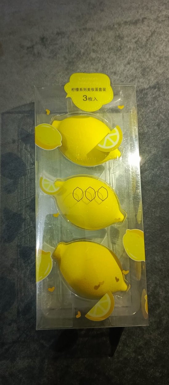 Yumuşak dokulu, sarı limon şeklinde 3'lü makyaj süngeri seti.