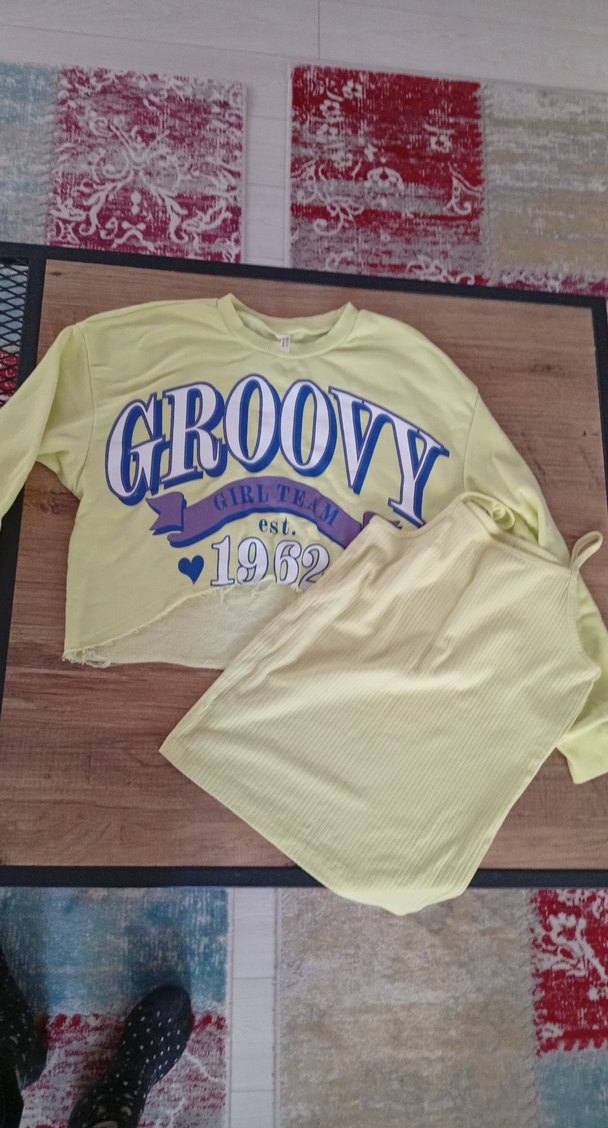 Pastel sarı, uzun kollu, loose fit kız tişörtü. Üzerinde 'GROOVY 1962' baskısı ve dantel detayları bulunur. Pamuklu, yumuşak kumaştan üretilmiştir.