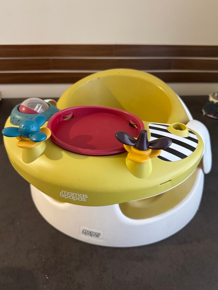 Mamas & Papas markalı, dönen oyuncaklı eğlenceli tepsiye sahip renkli sarı mama sandalyesi. ️ bazı deformasyonları var fotoğraflarda gösterdim ama süngerier ya da geç dökülüyor zaten.  Bir oyuncak eksik bir oyuncak kırık bunlardan dolayı fiyatı ucuz tutuyorum . Banyoda bir ya da iki kez kullandık artık içinde durmadığı için satıyorum