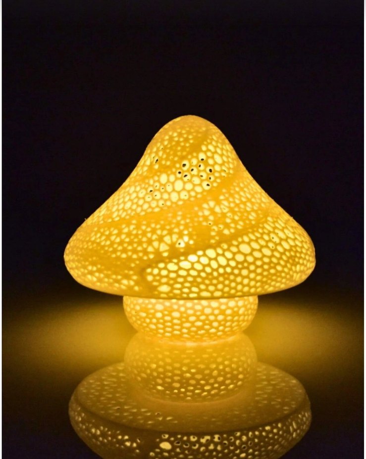 Sarı mantar şeklinde, renkli delikli tasarıma sahip masa lambası. Sıcak ışık desenleri oluşturur. sert plastiktir