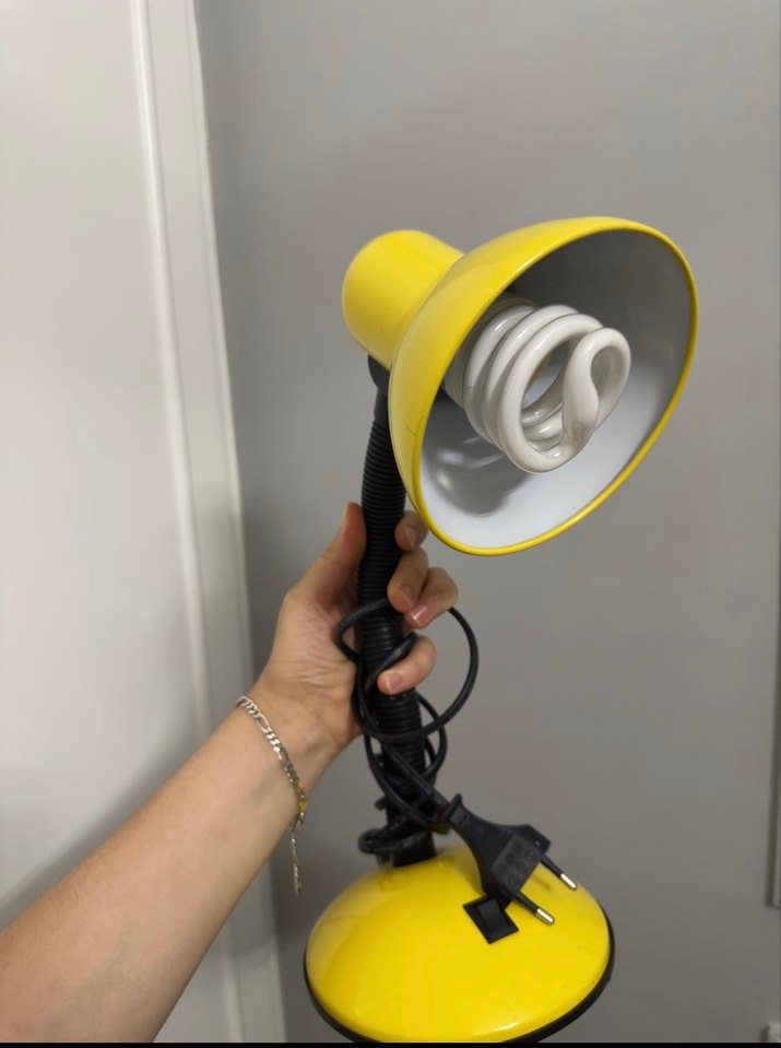 Esnek boyunlu ve enerji tasarruflu ampullü sarı masa lambası, odaklanmış aydınlatma için uygun.