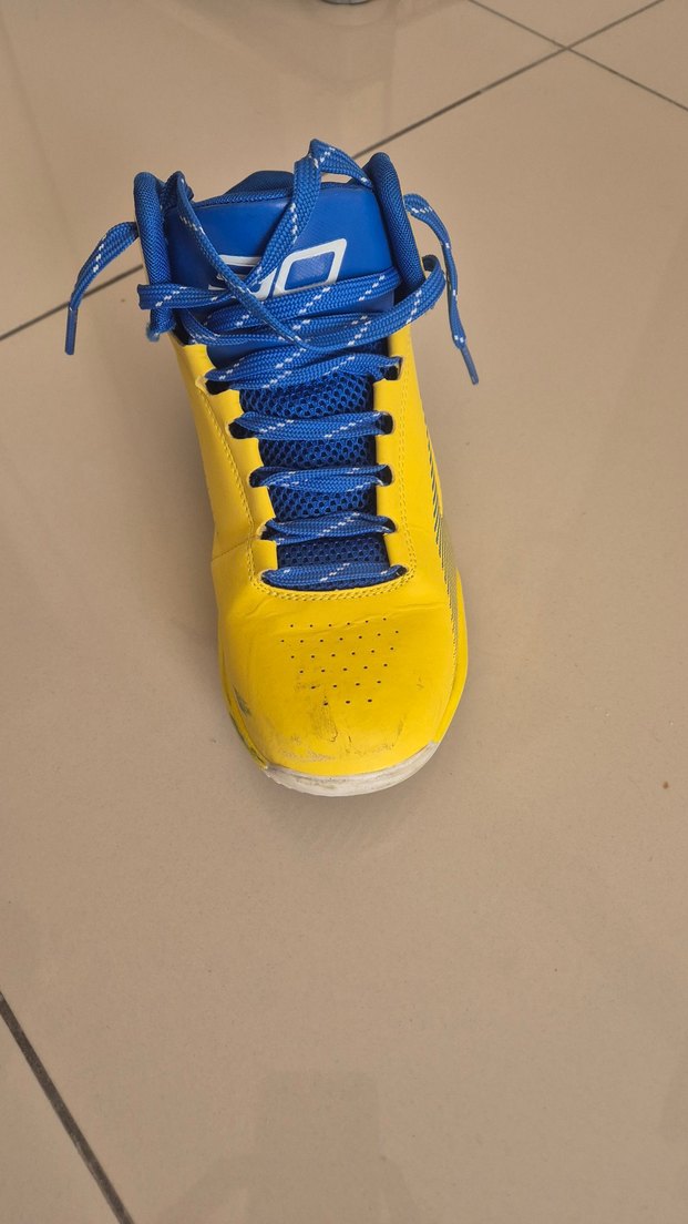 Sarı ve mavi renklerde, velcro ve bağcıklı, spor ve sokak stiline uygun kauçuk stephen curry basketbol ayakkabısı.