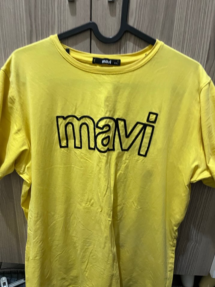 Sarı renkli, kısa kollu, yuvarlak yaka, bol kesim kız tişörtü. Önünde renkli 'mavi' baskısı bulunan rahat bir sokak giyimi parçası.