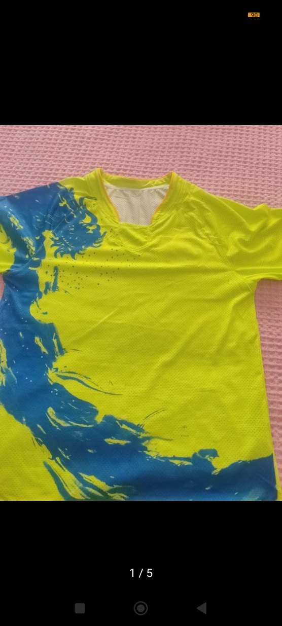Erkek spor tişörtü, bol kesim, kısa kollu ve bisiklet yaka. Canlı sarı zemin üzerine mavi baskılı desenler içerir. Sentetik kumaştan, spor ve günlük kullanıma uygun. ♂️