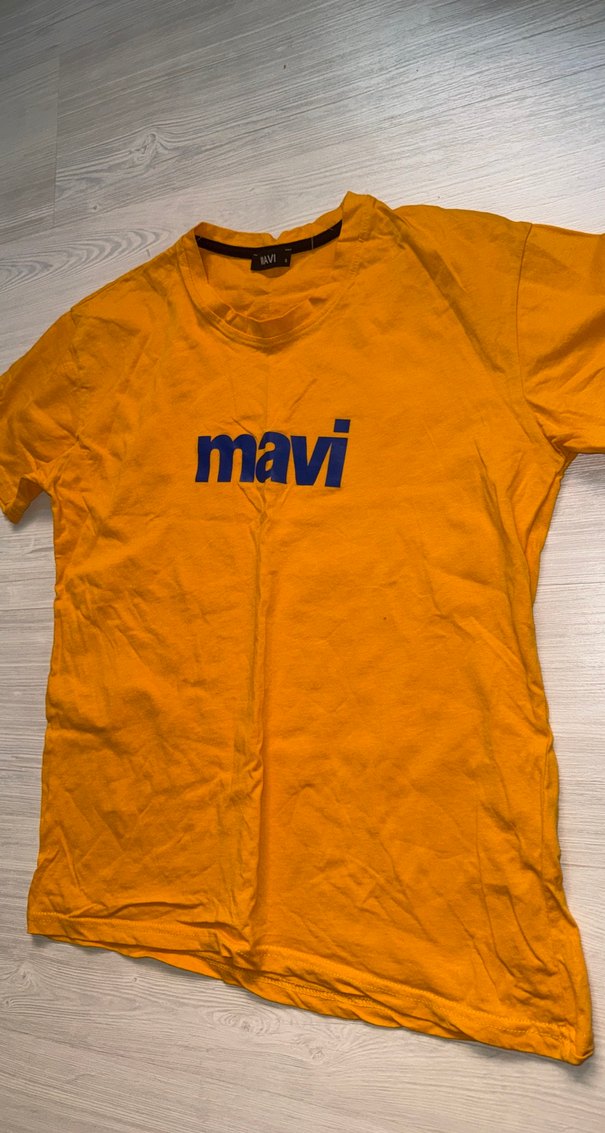 Sarı renkli, mavi "mavi" baskılı, kısa kollu, yuvarlak yaka ve bol kesim erkek tişörtü, rahat tekstil kumaştan üretilmiştir.